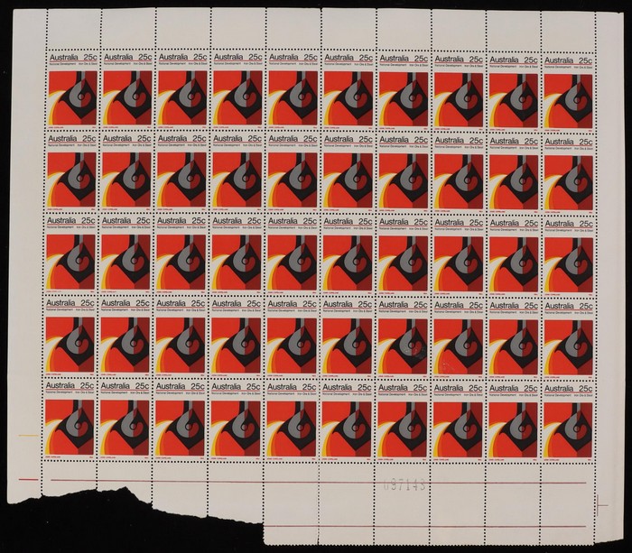 Development 25c Iron Ore upper pane of 50 with varieties 'lower portion of Copeland imprint missing' (pos 3/1) & 'lower portion of ND of Copeland missing' (pos 3/2) & sheet number in upper gutter. VF MNH. ACSC 632d/e za cat $130. (Image1)