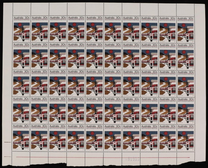 Development 30c Beef Roads marginal pr, error on top unit 'umber (brick cover) partly omitted' (no complete omitted known). VF fresh MNH. SG 543(var). ACSC 633c cat $750. Very rare as only 1 row of 10 recorded. (P) (Image1)