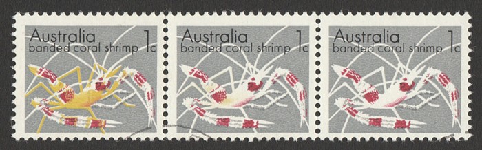Banded Shrimp horiz strip of 3, variety 'yellow OMITTED' on right stamp, only sl trace on centre stamp, left stamp normal. VFU. SG 545b cat £1200+ for single. ACSC 635cc cat $2500. (P) (Image1)