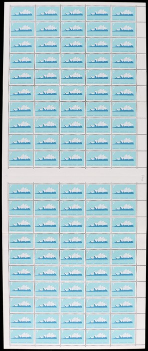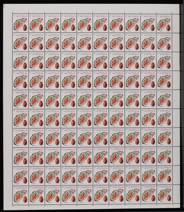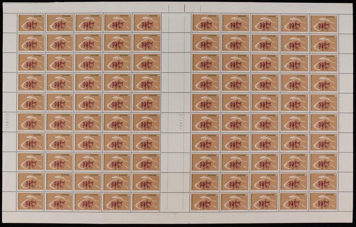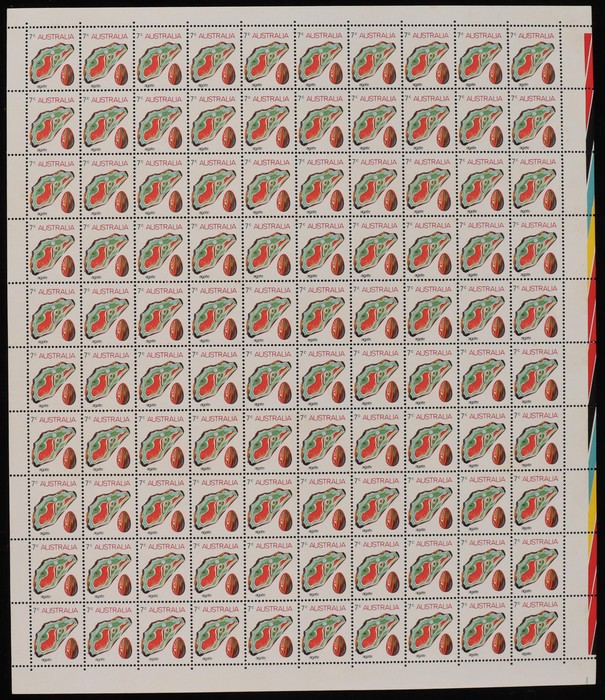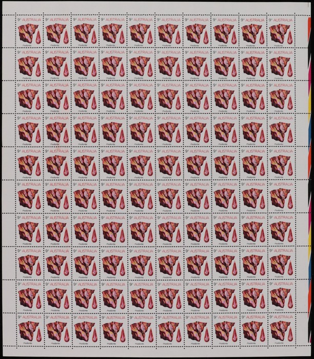 Rhodonite sheet of 100 with colour bars at right & T shaped guillotine guide UR cnr. Fresh MNH. ACSC 645 za cat $36. (Image1)