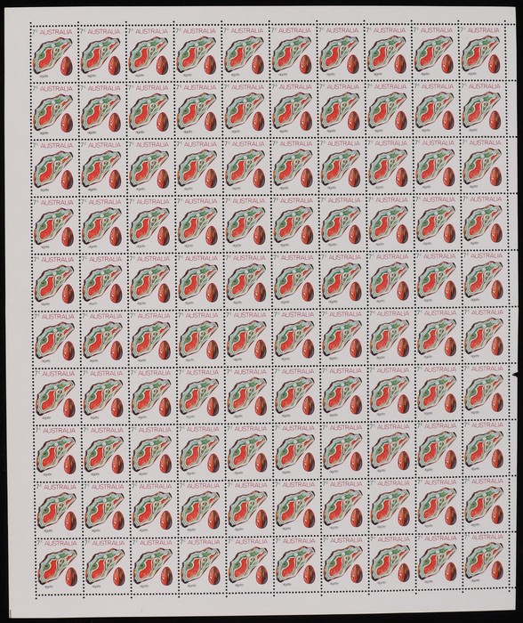 sheet of 100 with Autotrons at top, both sheet numbers & ACSC listed varieties 'retouch on wrist' (Pos RP1/4) & 'retouch on hand' (RP3/5). Reverse tropicalisation. VF appearance. ACSC 649 d e z za zb cat $95. (Image1)