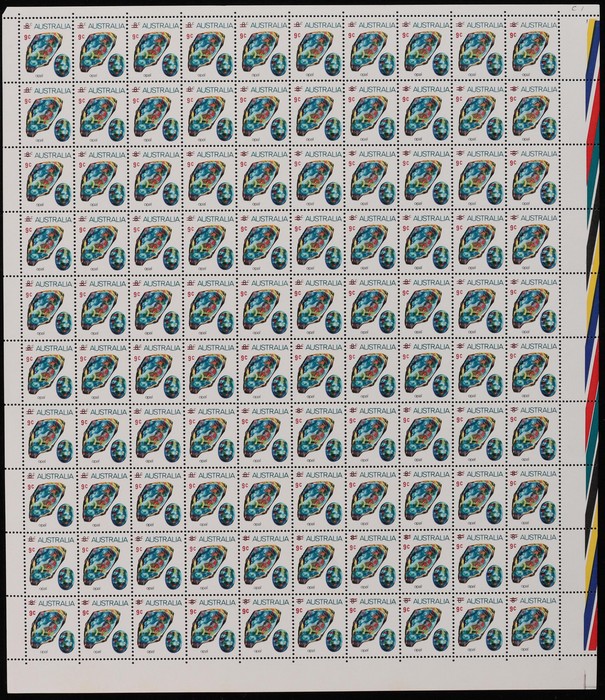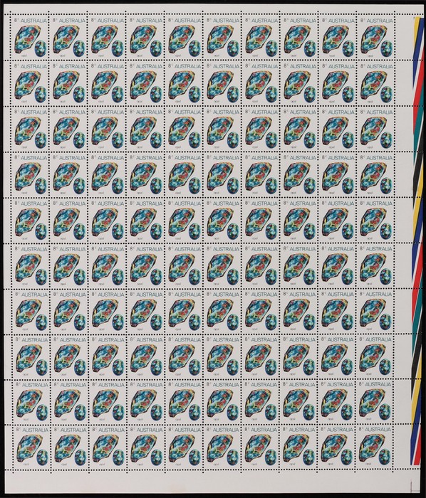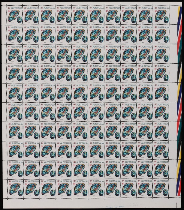 Opal sheet of 100 with colour bars at right, T shaped guillotine guide LR cnr & ACSC listed variety 'vertical line through uncut opal' (Pos Sheet A U6, 7/5). Fresh MNH. ACSC 644 d z cat $66. (Image1)