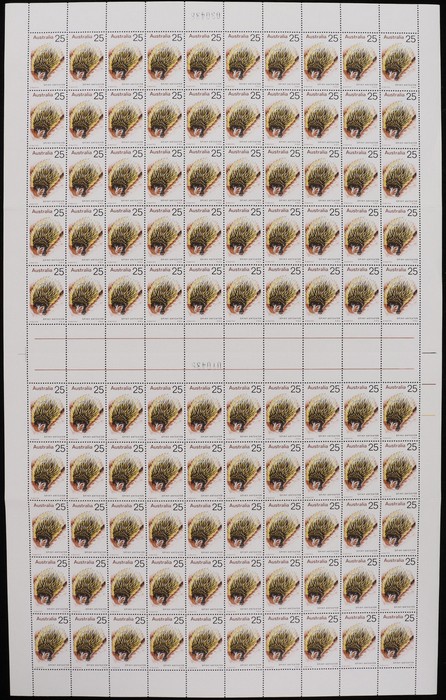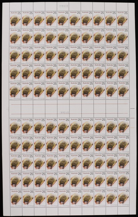 Anteater, sheet of 100 with Autotrons at right, black sheet numbers (upside down), 'retouch in brown right of top of front paw' (pos UP 1/5), '1st A of Anteater retouched' (LP 1/8), 'retouch in brown over rear paw (3/10) & 'retouch in brown at LL'