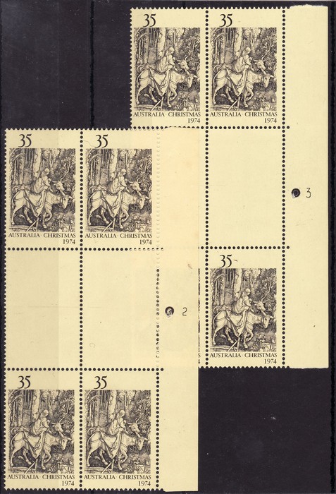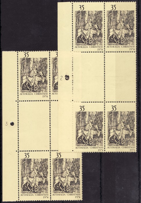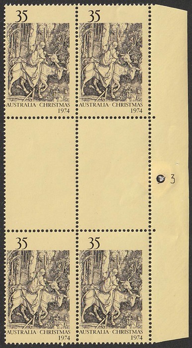 sheet of 100 with plate number 3 at left (Sheet A) with a range of constant plate varieties inc 'small spot between Australia & Christmas' (Pos 1/2), 'two re-cut lines on donkey's hind legs' (Pos 5/7), 'voids to ground shading at lower right' (Pos