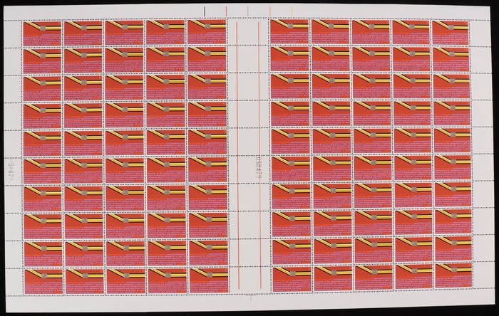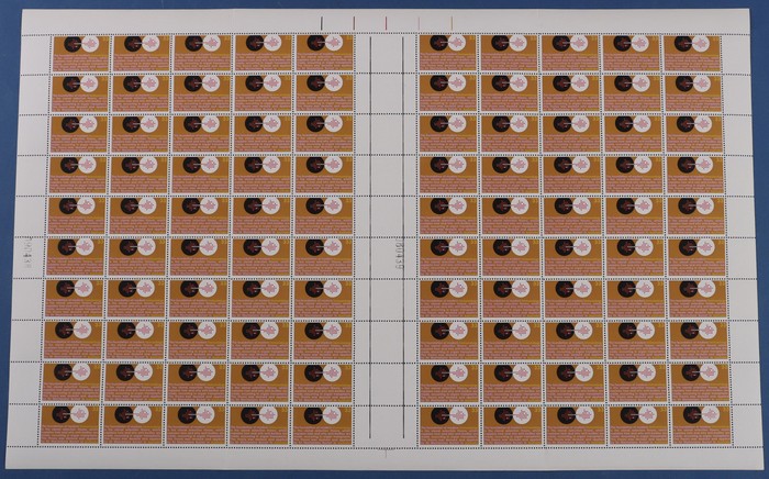 Atomic Absorption comp sheet of 100 with Autotrons at top, both sheet numbers & ACSC varieties 'weakness to orange bar at top' (pos LP 6/1) & 'broken O in To' (7/2). Fresh MNH. ACSC 705, d e z za zb cat $100. (Image1)