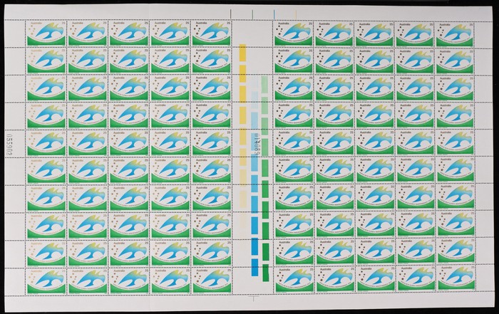 Diving on KP5D paper (clear gum) with autotrons at left, both black sheet numbers & ACSC listed varieties 'Retouch at last 'a' of Australia' (UP 5/2) & 'Weakness to Diver's lwr back' (LP 5/9). VF fresh MNH. ACSC 746 d e f z za zb cat $260. (Image1)