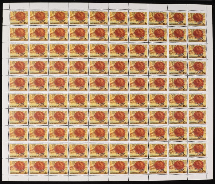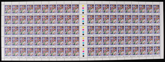 Gifts sheet & 100 with colour control circles in vert gutter & variety 'horizontal green line in US flag' (Pos 2/7, both panes). Couple of light tropical spots effecting a couple of stamps, o/w VF & fresh MNH. ACSC 851 d z cat $90+. (Image1)