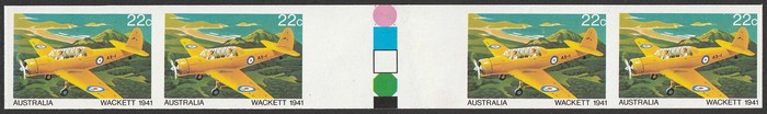 IMPERF horiz gutter strip of 4 with colour bar. VF fresh MNH, vert fold in gutter as always. Originates from the 2nd of only 2 imperf sheets recorded. SG 761(var). ACSC 883PP(3)(var) cat $400+ plus premium for colour bars that were not on issued