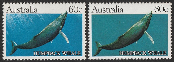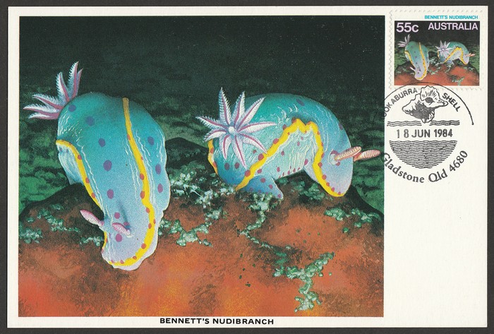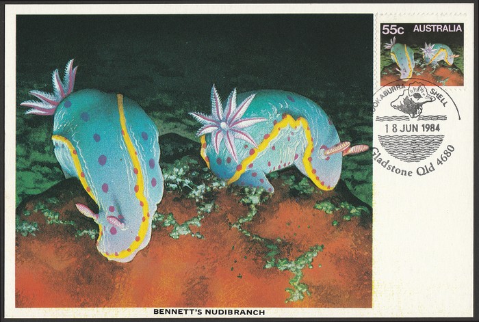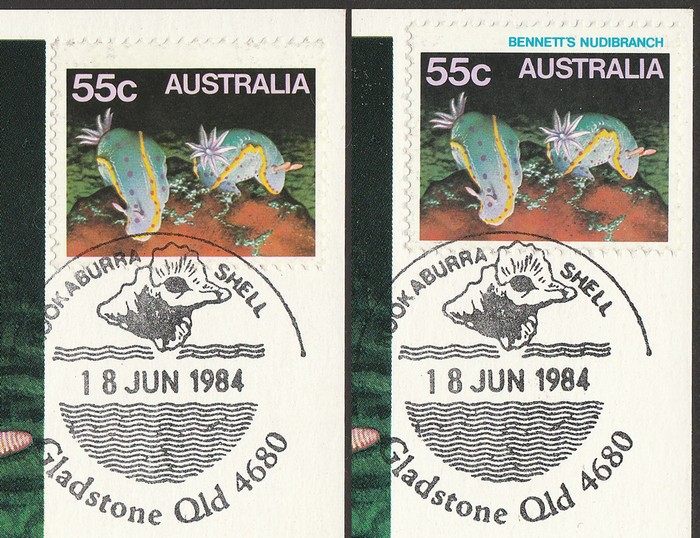55c error cyan colour totally OMITTED, so missing the inscription Bennett's Nudibranch from top margin. Superb fresh U on maxicard as always, plus normal to compare. SG 930a cat £1500. ACSC 1053c cat $2500 & this very item sold for $2000+ in a