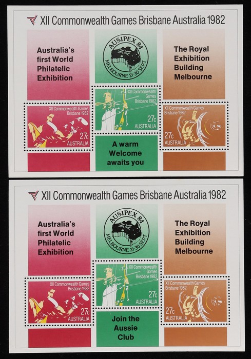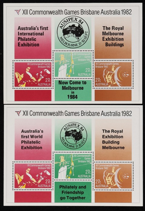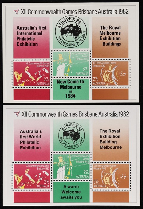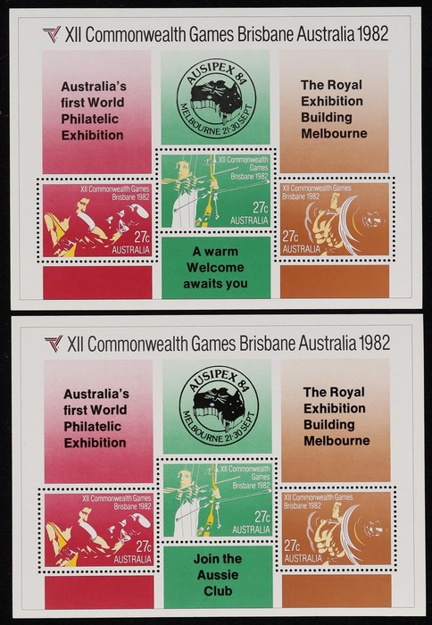 Games M/S with 2 diff Ausipex 84 promotional opts. VF fresh MNH. SG MS863(var). Retail $35. (2). (Image1)