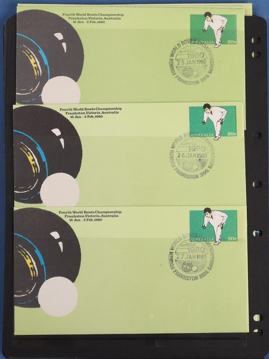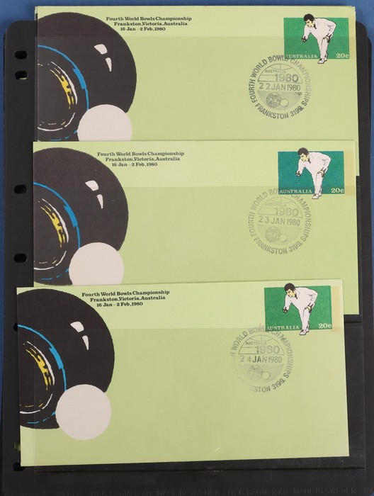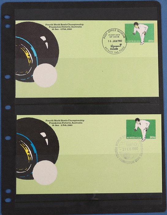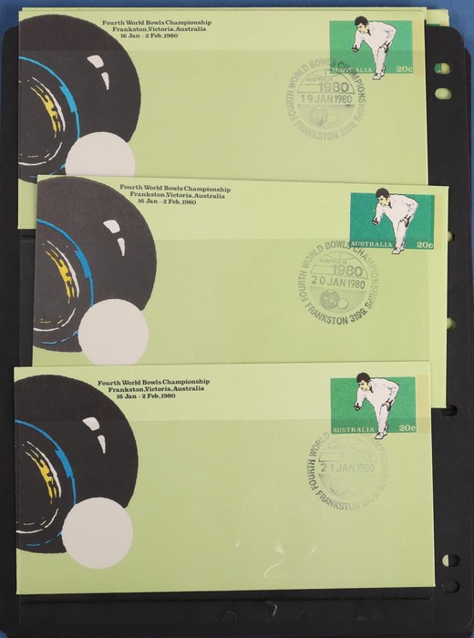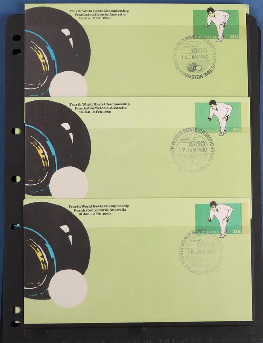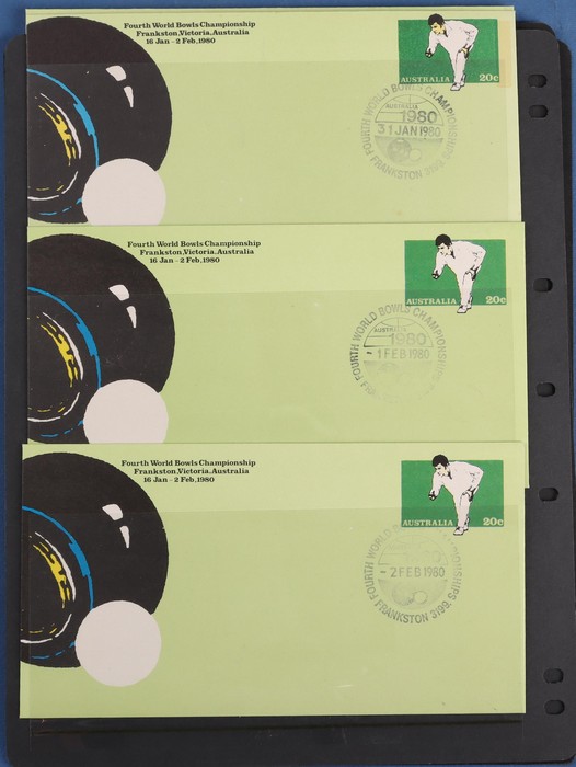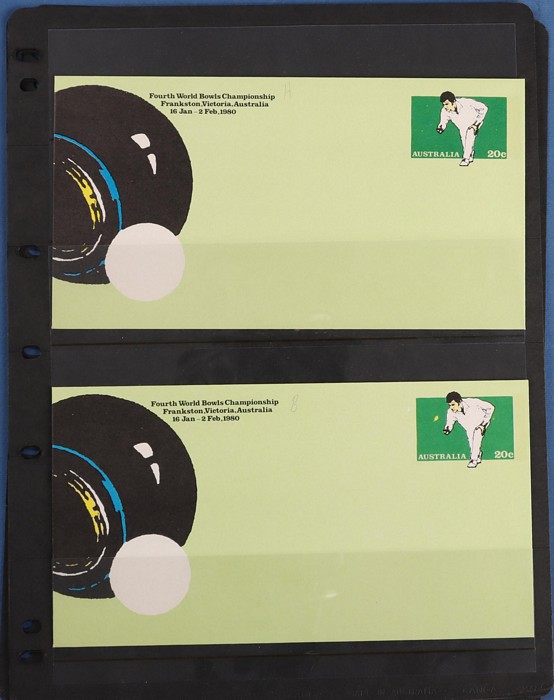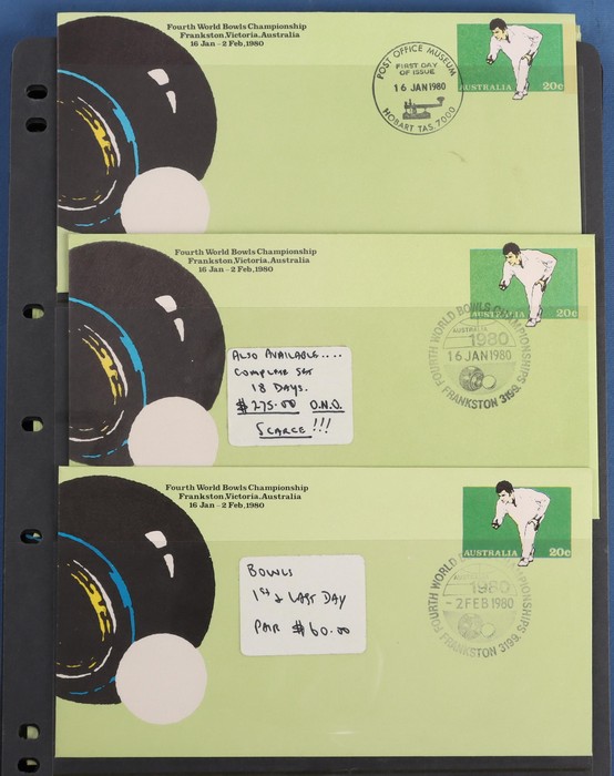 Championship 20c PSE comp set of 18 diff Commem pmks inc both the Sunday covers (unpriced). Pictor Mark cat $100 for 16 diff & under-rated! Also First Day & Last Day of Competition pr & 4 diff shades VF UN & normal FDC. A very difficult assembly.