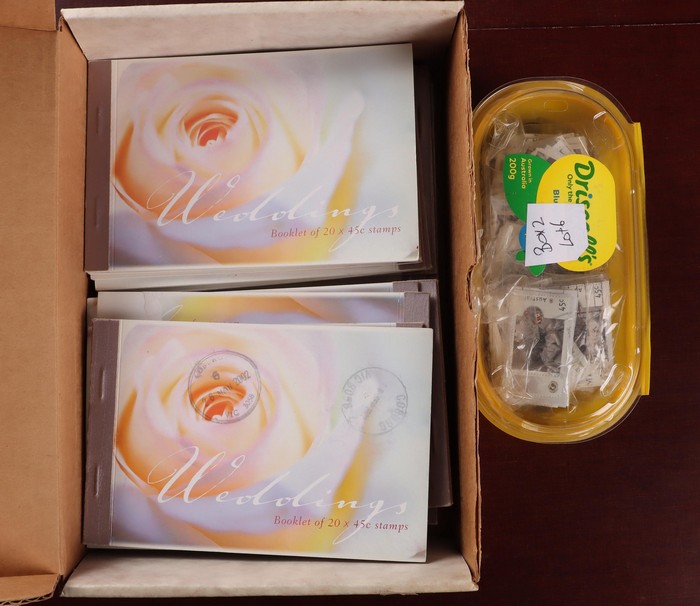 panes CTO/VFU inc 1982 Eucalyptus 60c (19), $1 (10), plus 1986 Alpine Flowers 5c (220), 25c (200) (retail $420), 1995 United Nations 45c sheet stamp set with tabs to left & right (100 ea), 2002 Wedding Prestige booklet (35) CTO (original FV $315)
