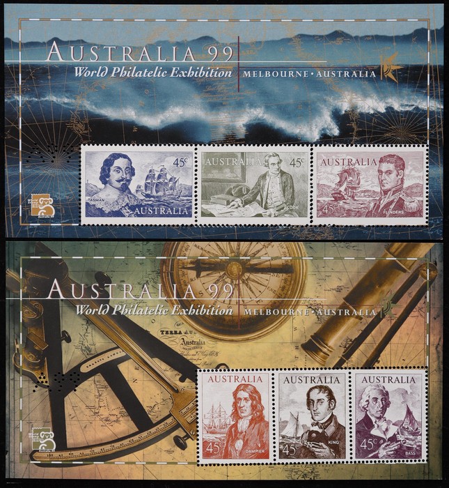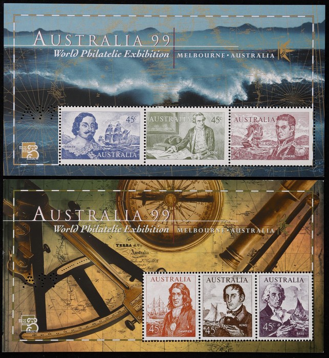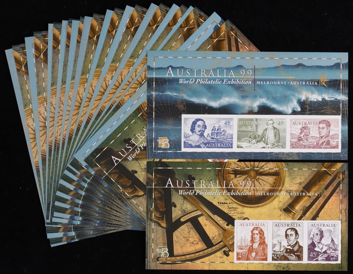 Philatelic Exhibition imperf M/sheets sets of 2 with 45c Dampier, King & Bass (50) & 45c Flinders, Cook & Tasman (50). Fresh VF MNH. Face value $135. ACSC 2181 cat $350, retail $1,250+ (100). (Image1)