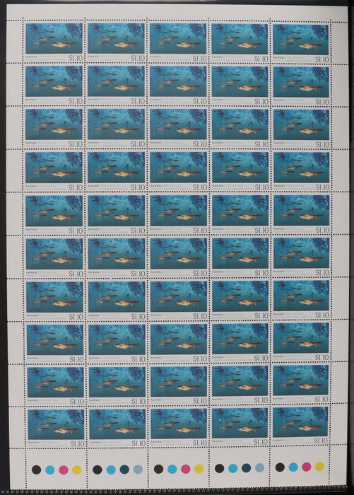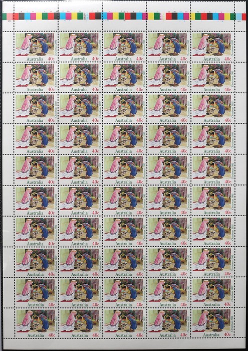 Printed 45c Kangaroos & Koalas imperforate blk of 12 with wide selvedge at base & 'Leigh Mardon' imprint on reverse. Not issued in this format & not listed in ACSC. F-VF MNH, 2 stamps light vertical crease. SG 1453/58(var). ACSC 1737-42(var). (12)