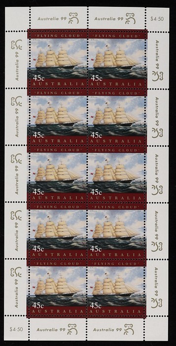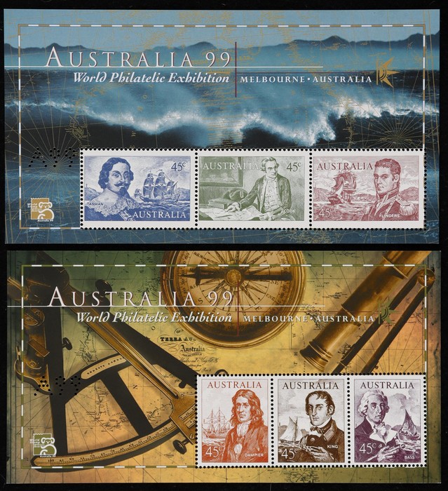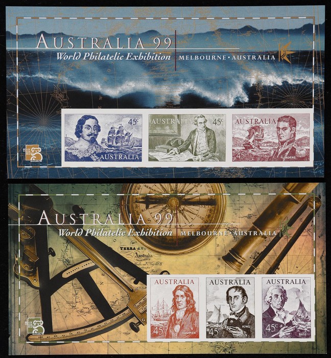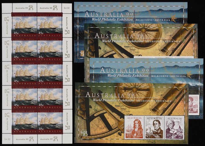 Navigators 45c M/Sheet pr with A99 Perfin, pr imperf & 'Flying Cloud', Ship 45c sheetlet of 10 with Exhib margin tabs. VF fresh MNH. SG 1727(var), MS1852c & 1852a/b. Retail $90. (5) (Image1) (Image2)