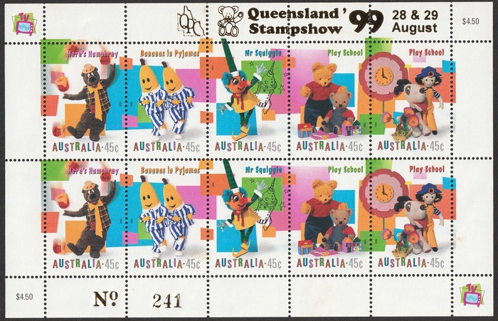 $4.50 sheetlet of 10, opt Queensland Stamp Show. Limited Edition no. 241. VF fresh MNH. SG 1871-5(var). Retail $36. (Image1)