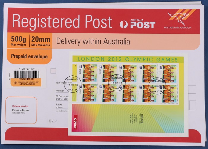 per envelope) plus Year Album composite. 2008 Beijing $5 set of 14, plus Paralympian. 2012 London $6 set of 7 (Jared Tallent presented later). Also Winter Games 2006 $5 Begg-Smith & 2010 $5.50, 2 diff. All with various FDI pmks. All diff. Stamps FV