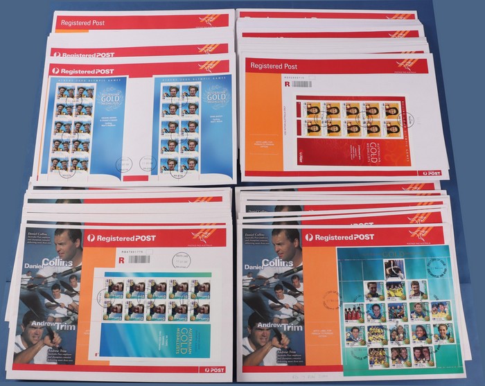 Gold Medalists sheetlets FDC using Registered envelopes, with Sydney 2000 digital Swan imprint $4.50 set of 16 plus composite sheetlet from Year Album, also offset printing (5 diff), Paralympians of the Year & Cathy Flame. 2004 Athens $5 set of 17 (2
