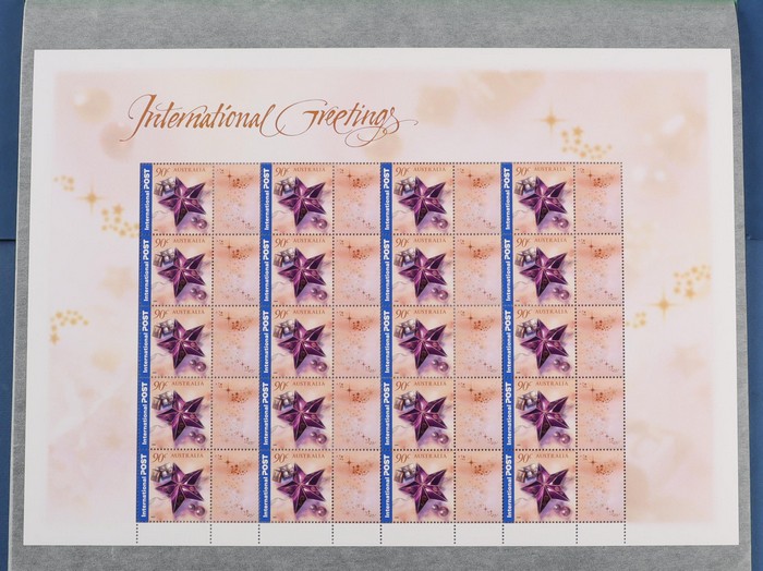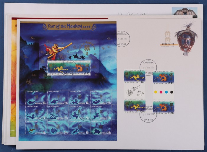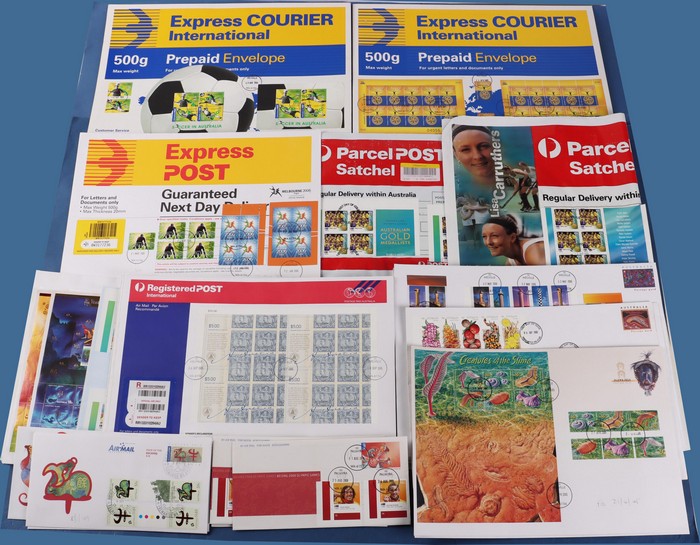 Archives large sizes in blks inc Carrington $5, Kangaroo £2 prs or blks, numerous blks from Prestige booklets. 2004-10 range of Christmas Is New Year sheetlets (5), plus International Express Courier large cardboard envelopes (2) inc Soccer