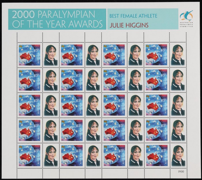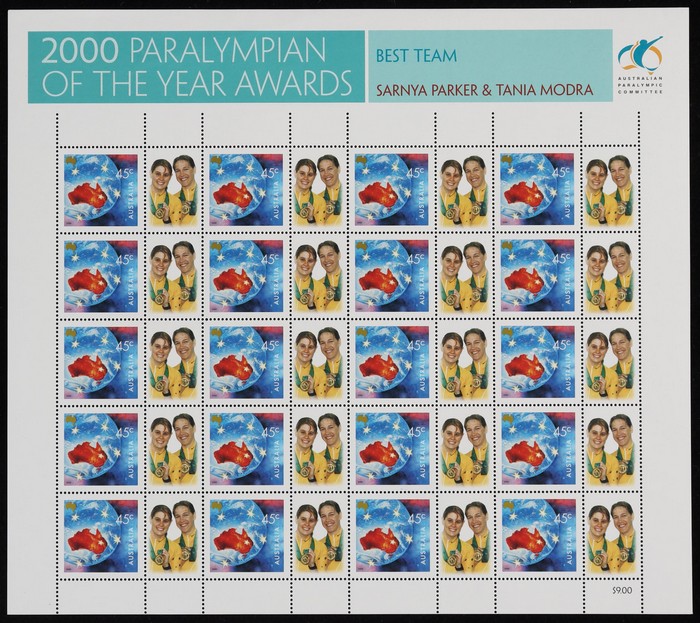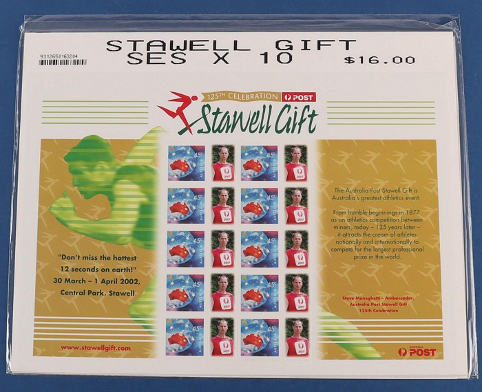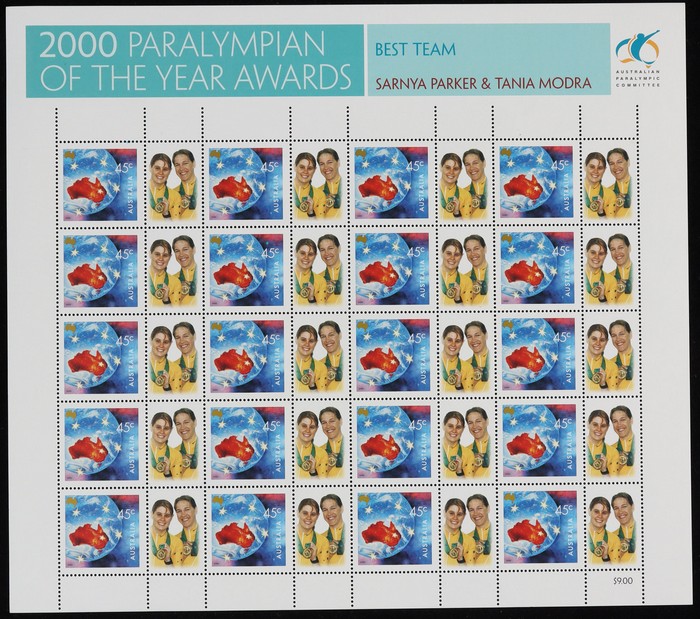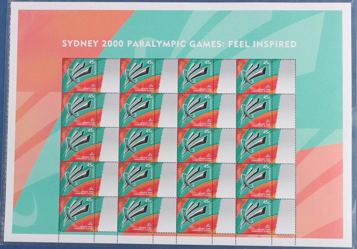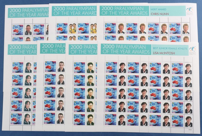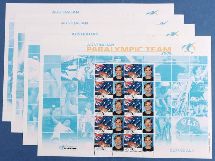 $4.50 SES of 20 45c Torch (2 diff), Teams SES of 10 from NSW, Qld, SA & Vic - these all with generic 'woman' tabs, plus Awards sheetlets of 20 (7 diff). VF fresh MNH. SG 1973-74, 2053-54 (var). FV $99 alone. (13 SES). (Image1) (Image2)