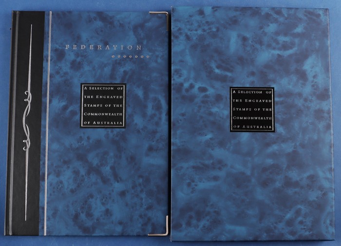 2) Federation - A Selection of Engraved Stamps of the Commonwealth of Australia De Luxe PO Book with slipcase, with 300 diff die proofs in blue inc 1927 Canberra, 1934 VIC Cent 1/-, 1935 ANZAC 1/-, 1936 SA Cent 1/-, 1937 NSW Sesqi 9d, 1949 Arms 10/-