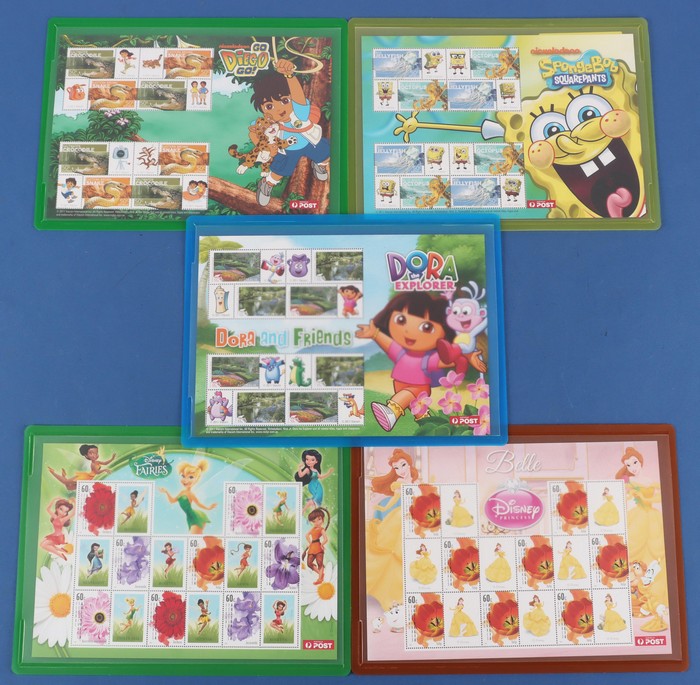 related with 50c Go Piego, 55c Sponge Bob, & Dora, 60c Belle & Fairies. All 8 stamps with tabs in sheetlets. FV alone $50. (5) (Image1)