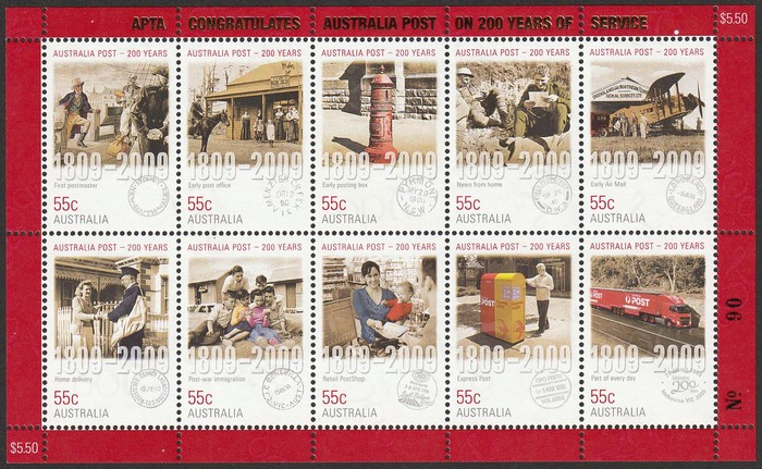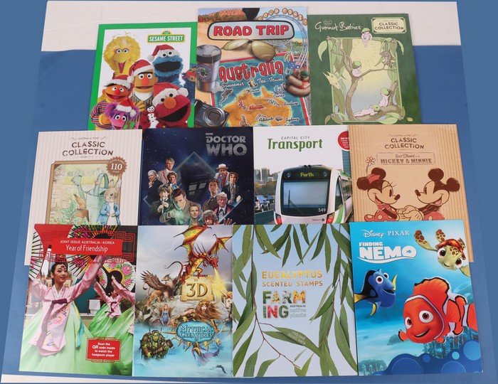 packs with 2010 Finding Nemo, Mickey Mouse, 2011 Mythical Creatures, Korea & Farming, 2012 Peter Rabbit, Dr Who, Transport & Road Trip large self adhesive sheet only found here, 2013 Gumnut Babies. Mostly sheetlets with special tabs, some M/Sheets.