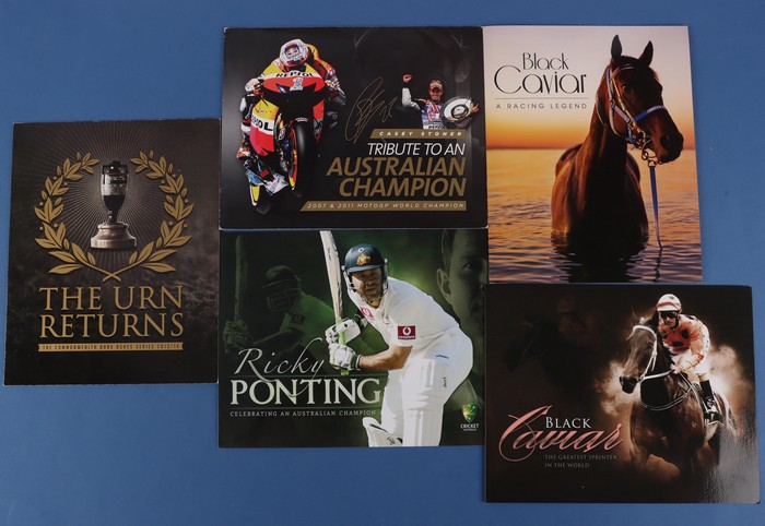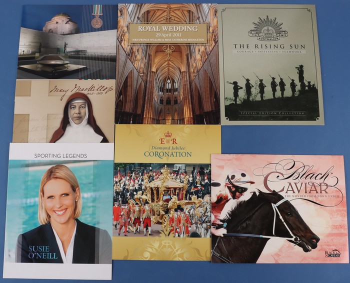 folders inc 2010 smaller size folders/packs for Mary MacKillop, plus National Service inc unique M/Sheet. The large size for 2011 Wedding, 2012 Rising Sun badge perf M/S, 2012 Susie O'Neill, Casey Stoner & Ricky Ponting, 2013 Coronation Anniv, Black
