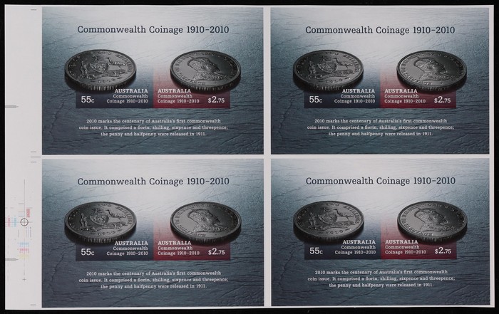 $4.10 M/Sheet imperf blk of 4 M/S from UL cnr of printer's sheet of 16 M/S, marginal markings at left, colour bar & blks at top jumbo margin of 230mm. SG MS3269(var). Retail $45 ea, so $180 for this. (Image1)