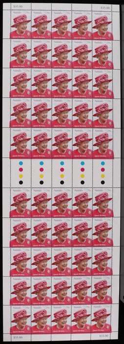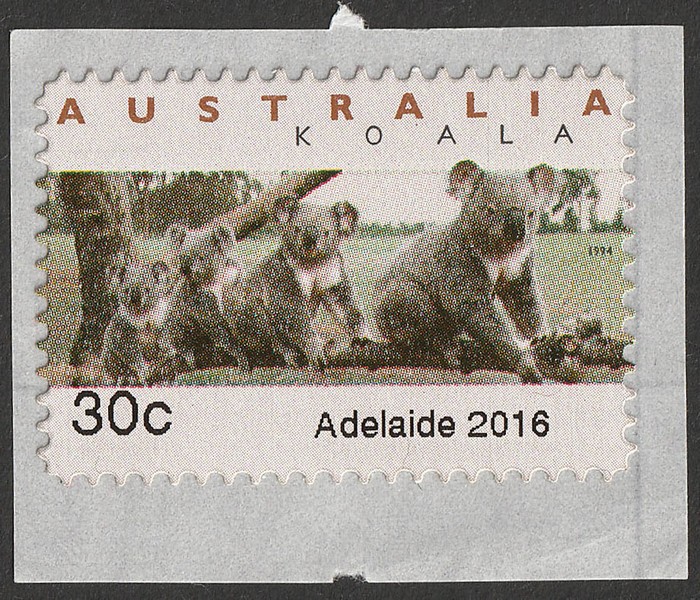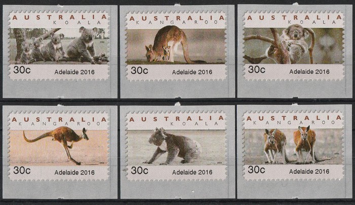 Emergency issue CPS Kangaroos & Koalas 30c set of 6 self-adhesives, type A. Made in Adelaide GPO using the Counter Printed stamp machine. Due to postage rate increase from 70c to $1.00, the 30c make-up values were urgently needed. SG 4492-97 cat
