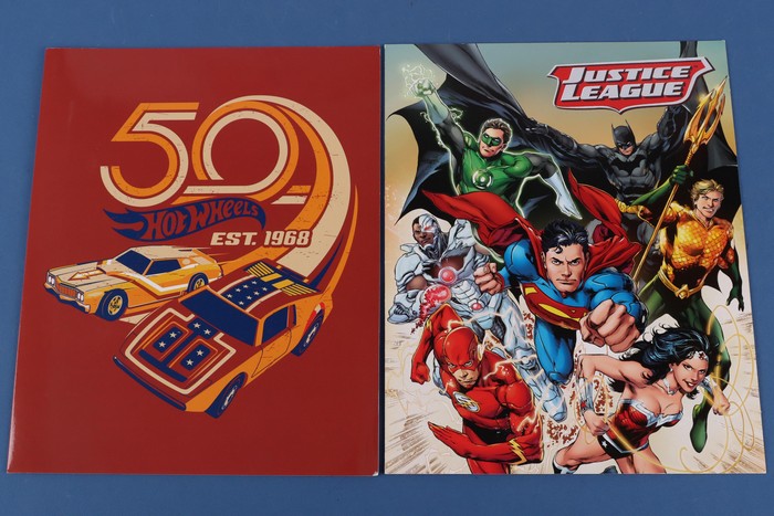 & Justice League folders, ea with 2 panes of 10 stamps with 10 tabs. Original PO cost $46. FV alone $40. (Image1)
