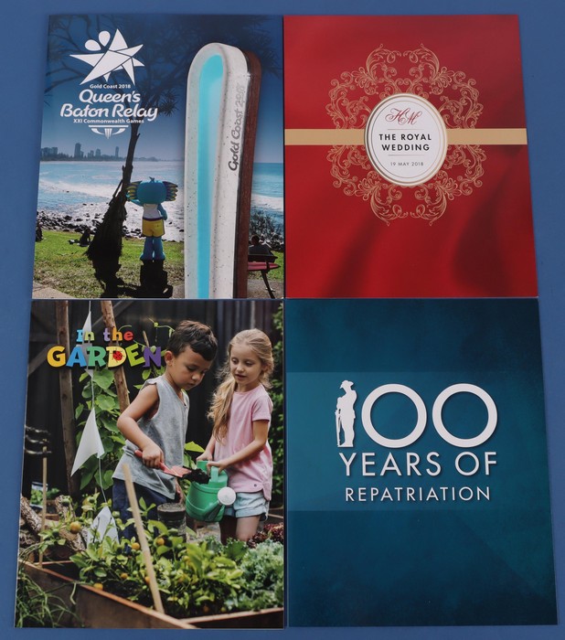 Commonwealth Games Baton Relay, 2018 Harry & Megan Wedding & Repatriation Anniv, 2019 In the Garden PO Packs. SG 7900, 4981, 4993 & 5108-13. FV alone $42. (4) (Image1)