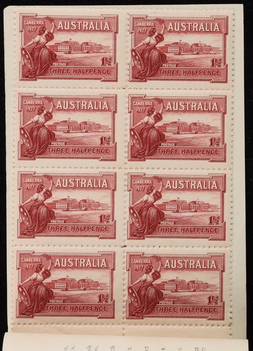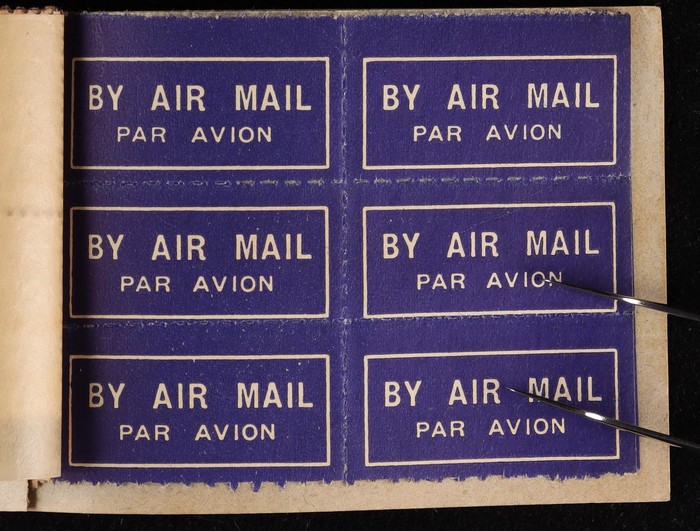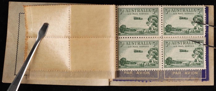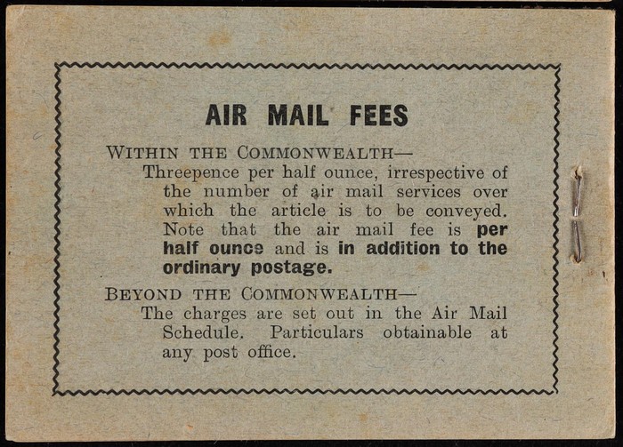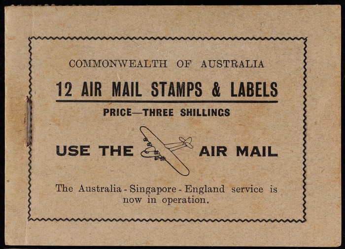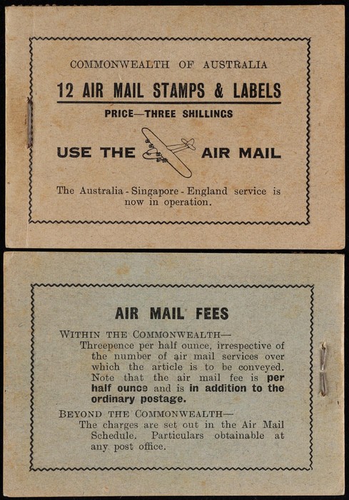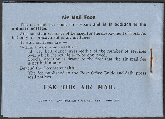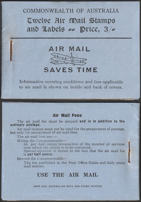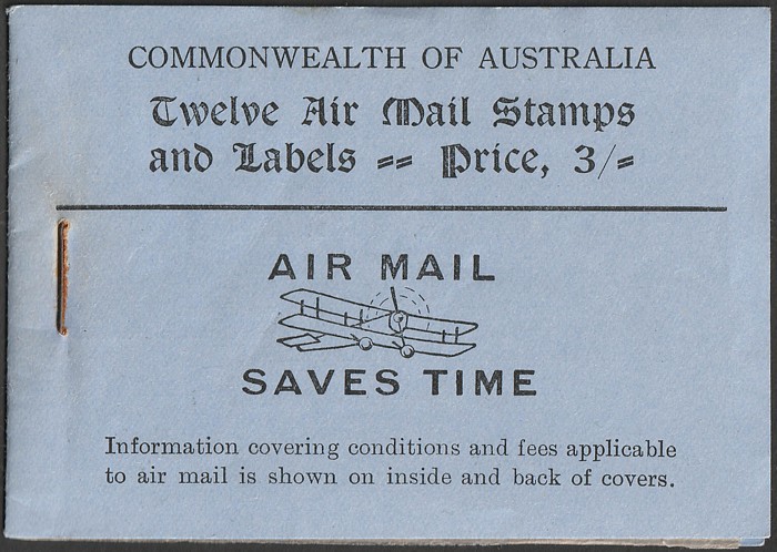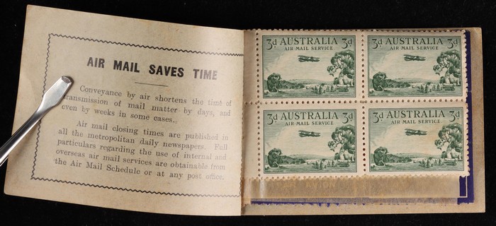 booklet with black on blue cover "Air Mail Saves Time", with Airmail 3d green 3 panes of 4 & 2 panes of Air labels & wax interleaves. Superb fresh MNH. SG SB24 cat £850+. ACSC B40 cat $1500 which is incorrect as stamps ACSC 136c cat $2250 for 3