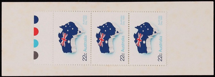 Eastwood-Epping Stamp Bourse with 3 Aust Day 22c attached by upper traffic light selvedge. VF. Pfr UB13-81b cat $100. (Image1) (Image2)