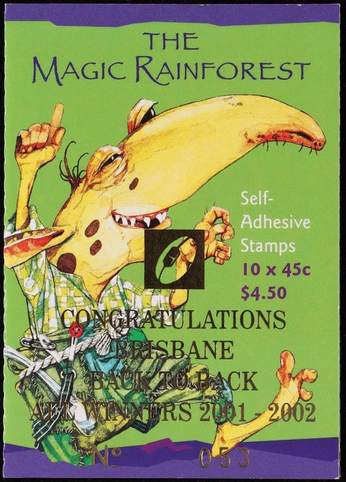 Rainforest $4.50 generic barcode, opt AFL Brisbane Winners. Limited Edition no. 053. VF fresh MNH. SG SB155(var). Retail $26. (Image1)