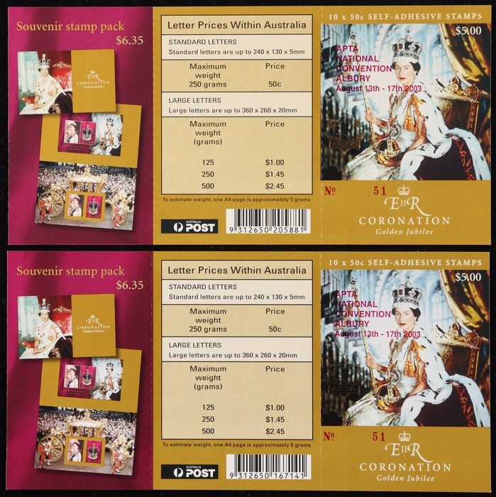 Coronation Anniv $4.50 both barcodes, opt APTA Albury Convention, numbered. VF fresh MNH. SG SB161(var). Pfr B254(3)/a cat $60. (2). (Image1)