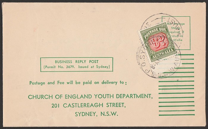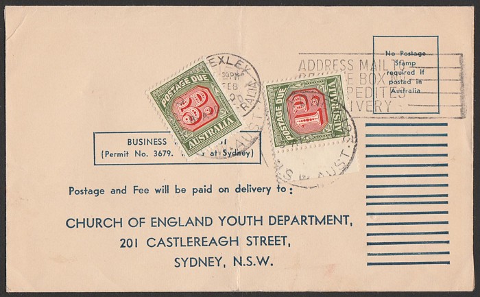 II & 5d Die II tied to 1960 Business Reply Post envelope from Bexley to Sydney (ACSC D151 cat $200). 6d Die II single franking from Naromine to Sydney (D155 cat $30). Both with GPO Sydney arrival cds. VF, total cat $230. (2) (Image1) (Image2)