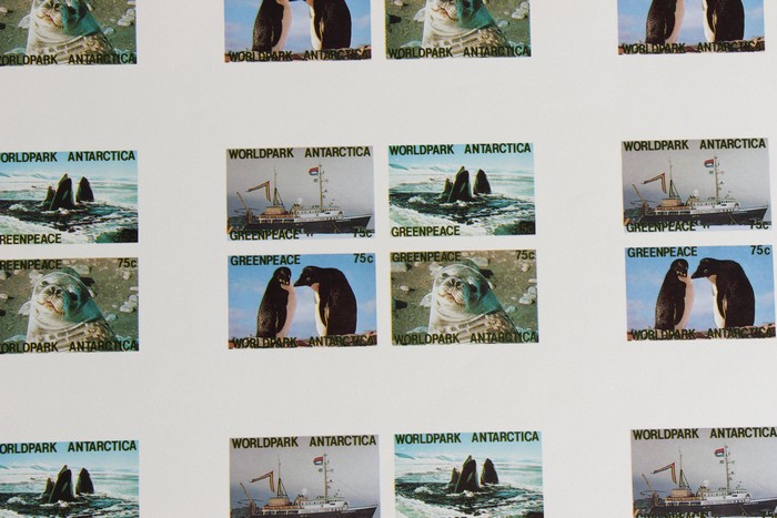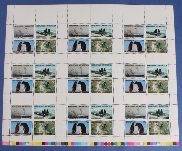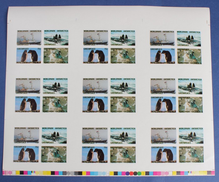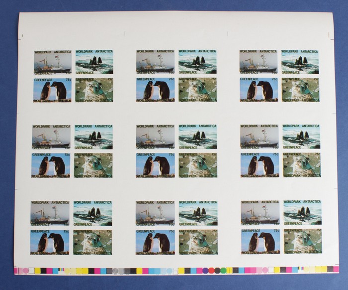 World Park Antarctica 75c x 4 M/Sheet in uncut blk of 9 M/S, both perf & imperf. VF fresh MNH. (72 stamps in 18 M/S) (Image1) (Image2)