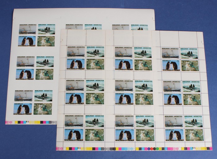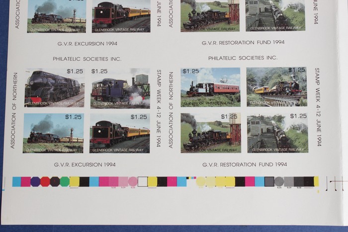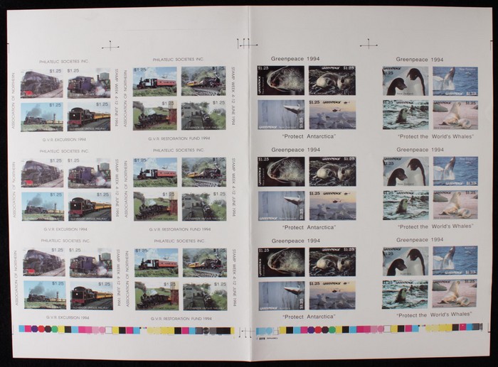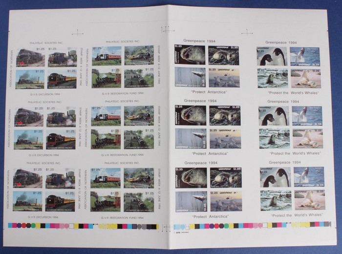 Glenbrook Vintage Railway $1.25 M/Sheet of 4 diff train stamps (2 diff M/S), plus Greenpeace Protect Antarctica & Whales $1.25 M/S of 4 diff (2 diff M/S). All as 1 uncut sheet imperf, variety sl shift of black causing blurred white text, doubling