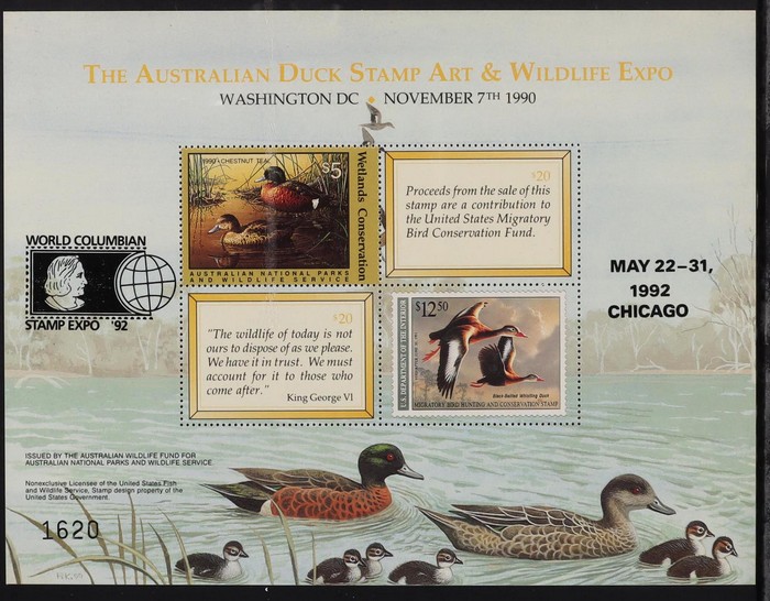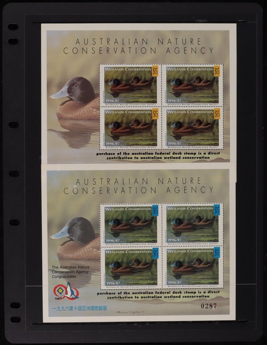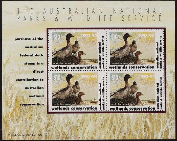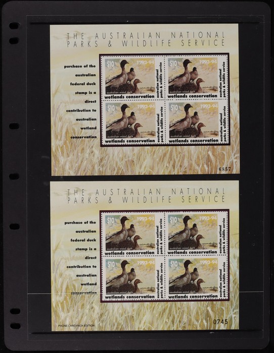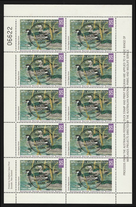 Conservation $15 Ducks sheet of 10. VF fresh CTO (MNH gum) with 'Issued at Kakadu National Park' h/s. FV $150. (Image1)