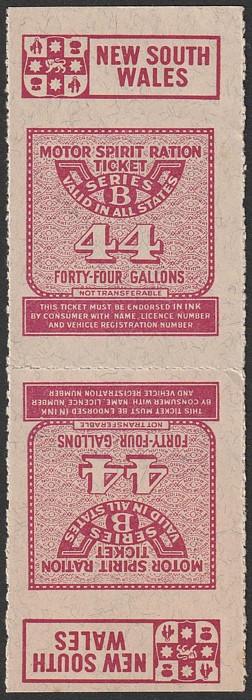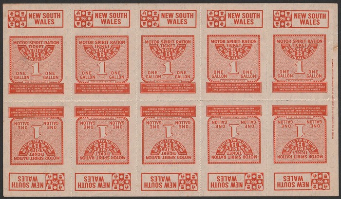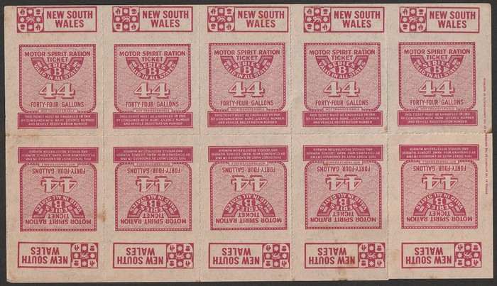 Coupon: NSW: 44 Gallons magenta series B tete-beche sheet of 10 with Authority Imprint at right & Lane Cove Council 'security' cachets on reverse. Some reverse toning & lwr right cnr stamp replaced. An attractive & very rare multiple. (P) (Image1)