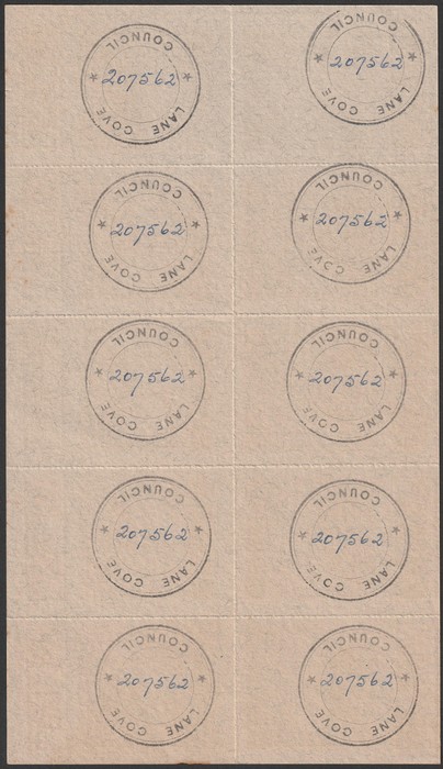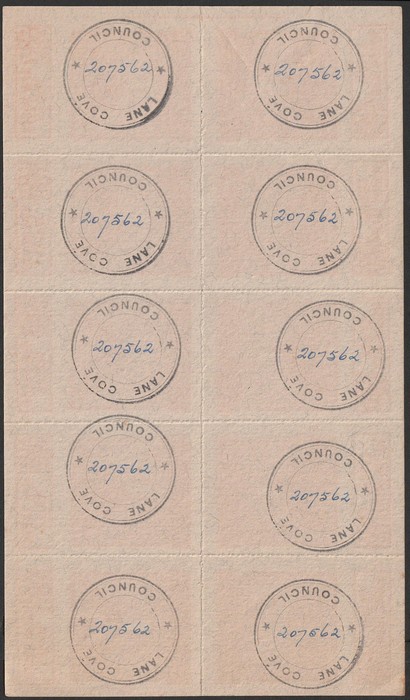 Coupon New South Wales 10 Gallon green series B tete-beche sheet of 10 with Authority Imprint at right. VF UN with Lane Cove Council 'security' cachets on rev. (P)
