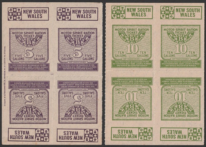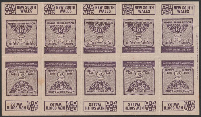 Coupons: New South Wales 1 Gallon orange & 5 Gallon violet, both Series B, tete-beche sheets of 10 with Authority imprints at right. Scattered mostly light tones, generally F-VF UN. (2 sheets) (Image1) (Image2)