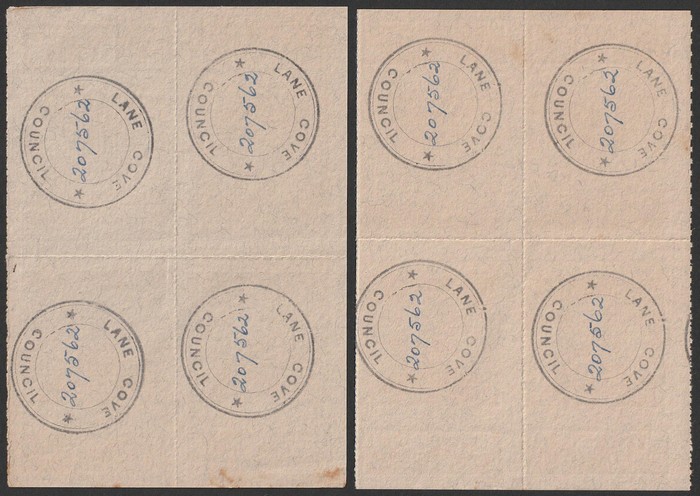 Coupon NSW 10 Gallon Green & 5 Gallon violet, buff series B, tete-beche blks of 4, 5 Gallon traces of tone spots at top plus Authority Imprint at right. F-VF UN with Lane Cove Council cachets on rear. (8). (Image1) (Image2)
