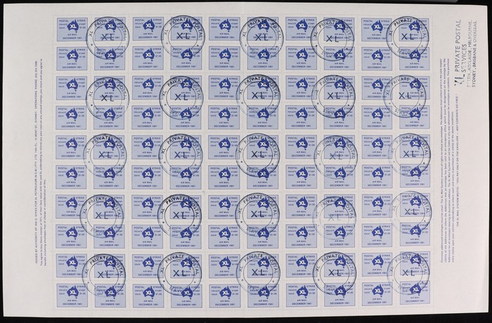 XL Petroleum $1 blue private postal service sheet of 100. VF fresh CTO 'XL Private Postal Service'. Retail $5 ea = $500. (Image1)