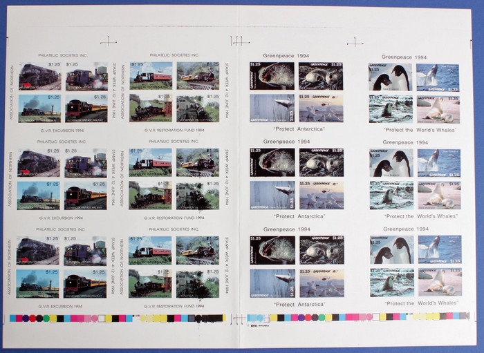 Glenbrook Vintage Railway $1.25 M/Sheet of 4 diff train stamps (2 diff M/S), plus Greenpeace Protect Antarctica & Whales $1.25 M/S of 4 diff (2 diff M/S). All as 1 uncut sheet imperf, variety missing 'Australia' on LR stamps of lower 2 Greenpeace