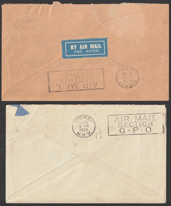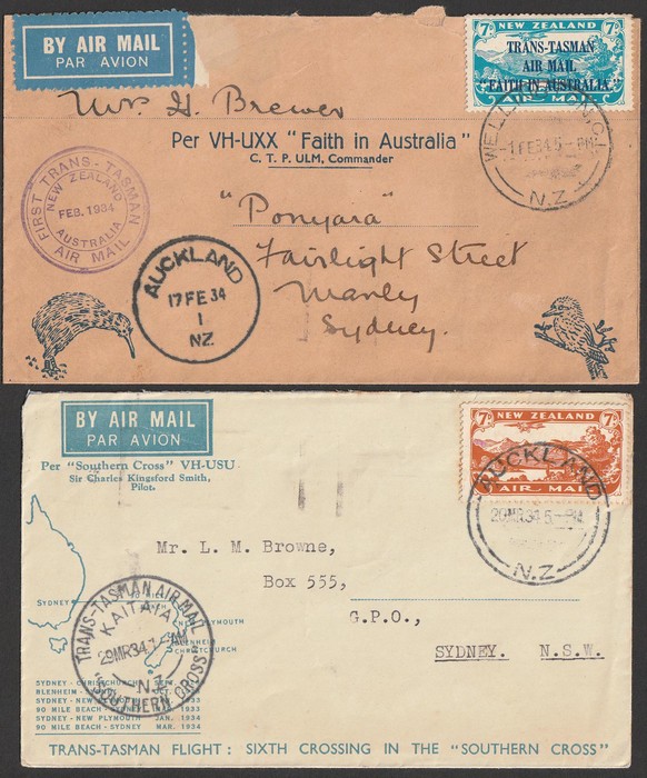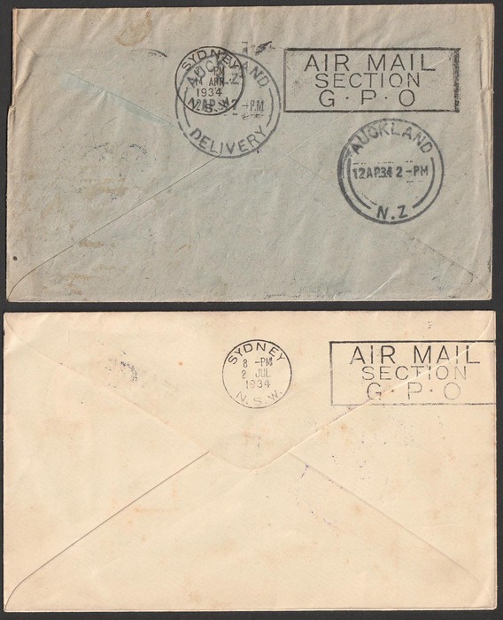 Australia Flights to NZ 'Feb 1934' franked Faith in Australia opt 7d. Mar 1934 Kaitaia franked Air 7d, April 1934 Aust-NZ & return franked Australia & NZ Airmails. July 34 Kaitaia to Aust franked Air 7d. AAC 360 cat $300. (4). (Image1) (Image2)
