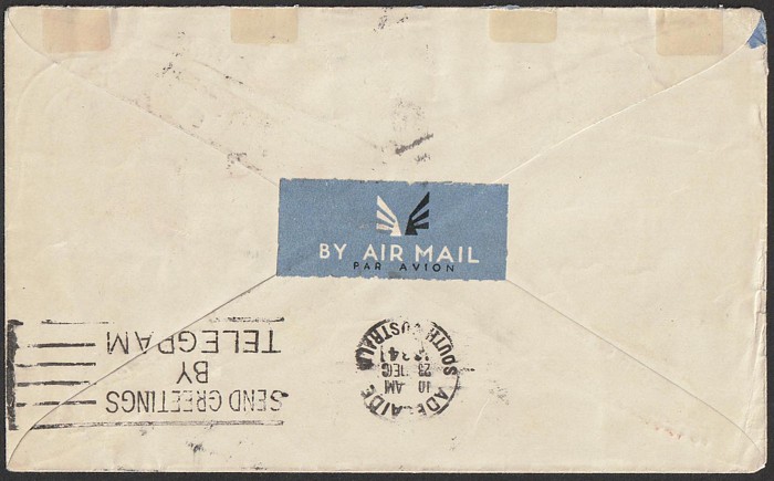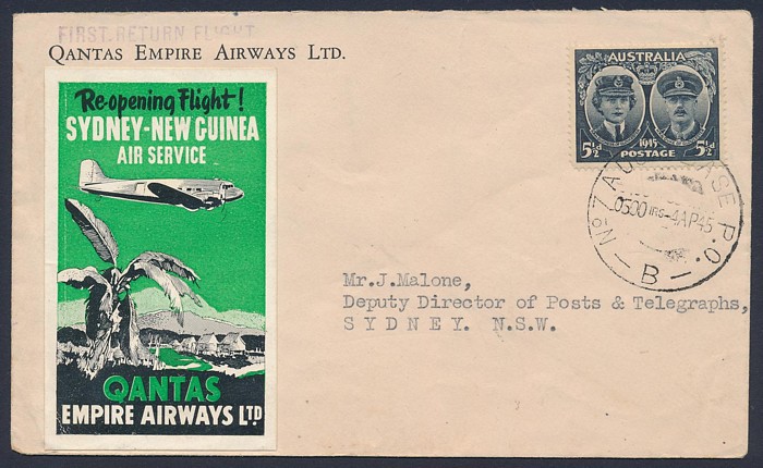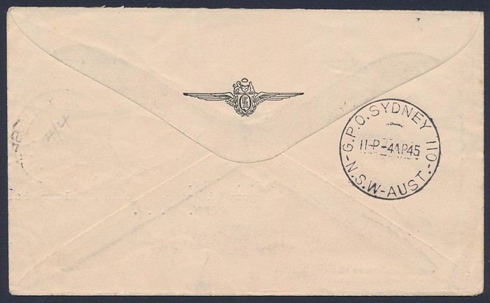 Sydney flight franked Gloucester 5½d tied by No 7 'Aust Base PO 4 AP 45' cds & with green vignette, Sydney arrival b/s. AAMC 1003 cat $275. (P) (Image1) (Image2)
