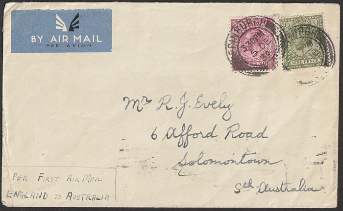 England-Australia FFC franked KGV 6d & 9d, tied by 'Edinburgh 5 DE 34' cds. To Sth Aust with Adelaide b/s. AAMC 469 cat $75. (Image1) (Image2)