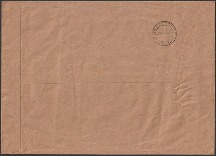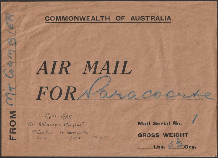 of Australia oversize 26.5x19cm generic envelope from Mt Gambier to Naracoorte with arrival b/s & (unofficial) m/s notation 'First Mail per AN Airways 'Moogana' Mt Gambier to Naracoorte 9.15a 9.50a 30.8.37'. An extremely rare PO outer envelope for